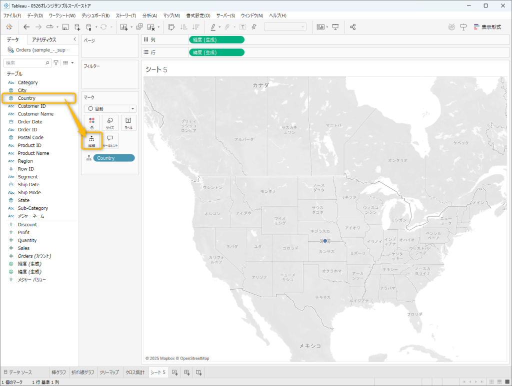 - 地理的ディメンションを「国:Country」マークカードの「詳細」にドラッグ