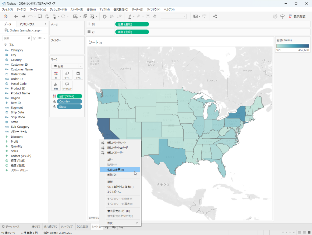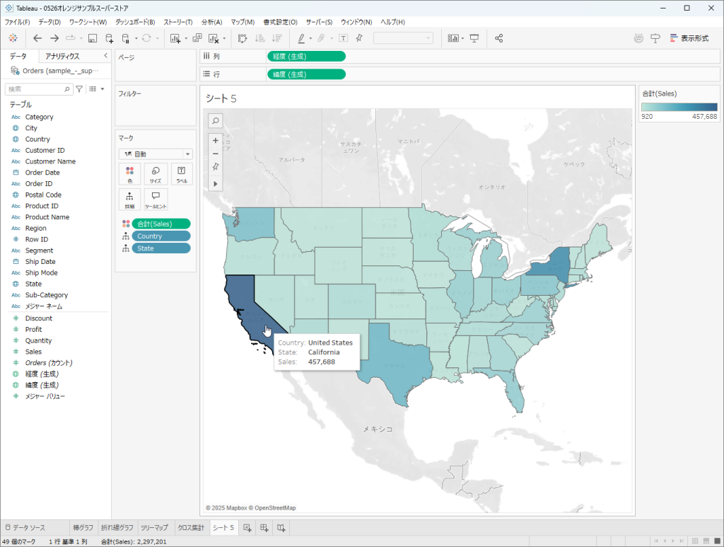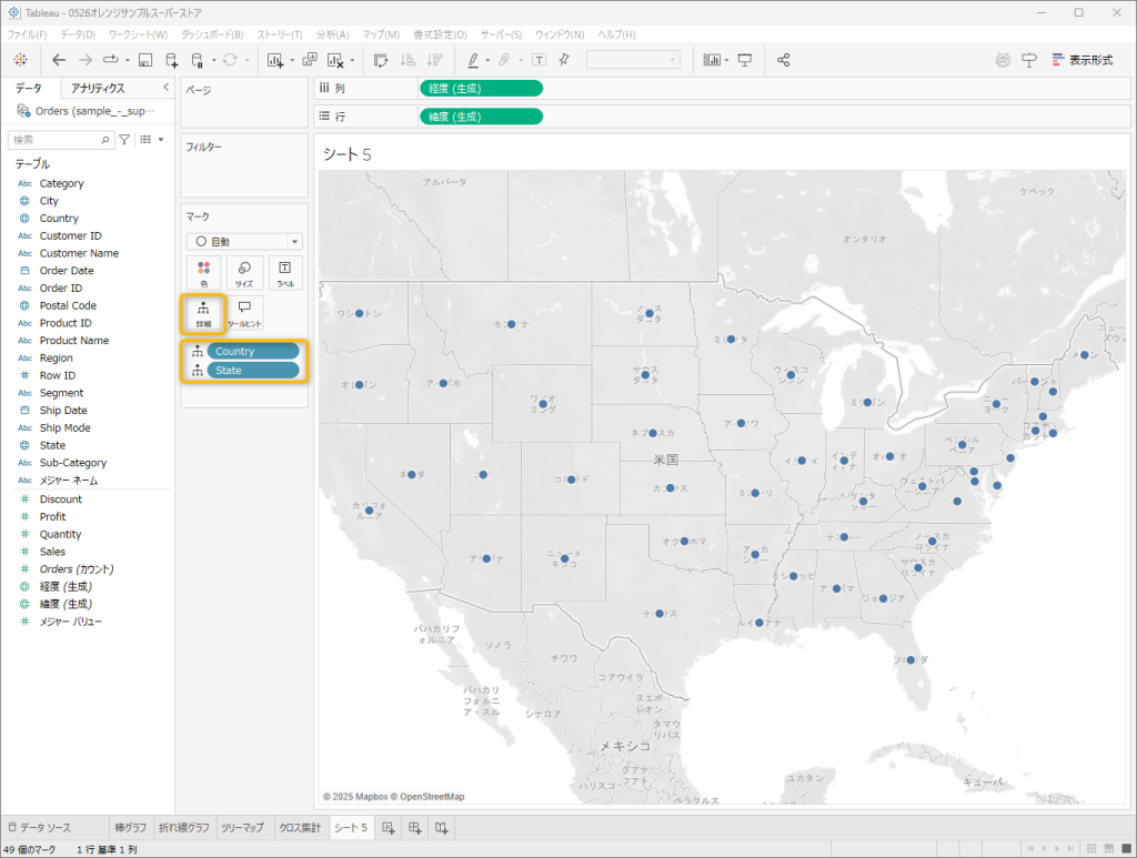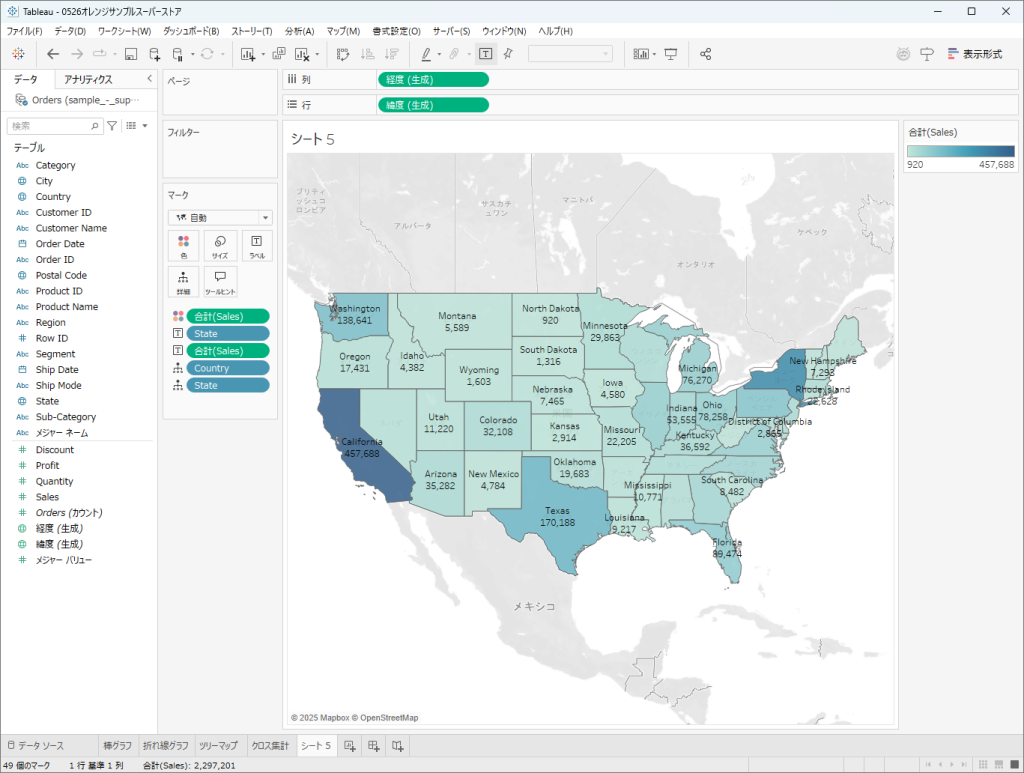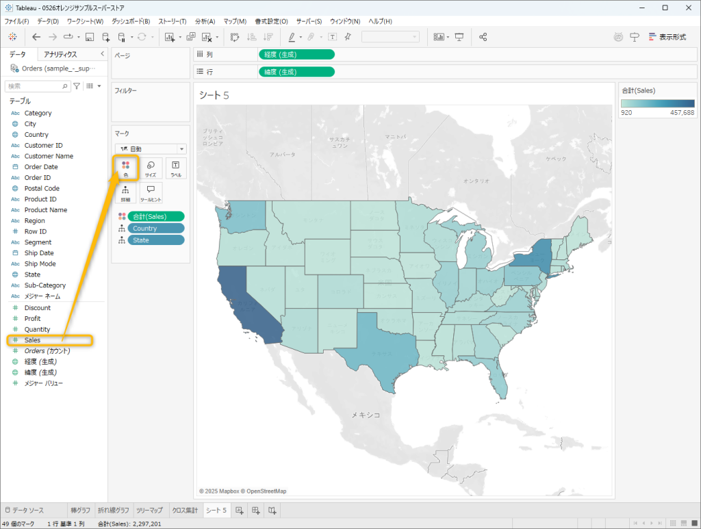 - 「州:State」「売上:Sales」をマークカードの「Tラベル」にドラッグするとラベルを表示