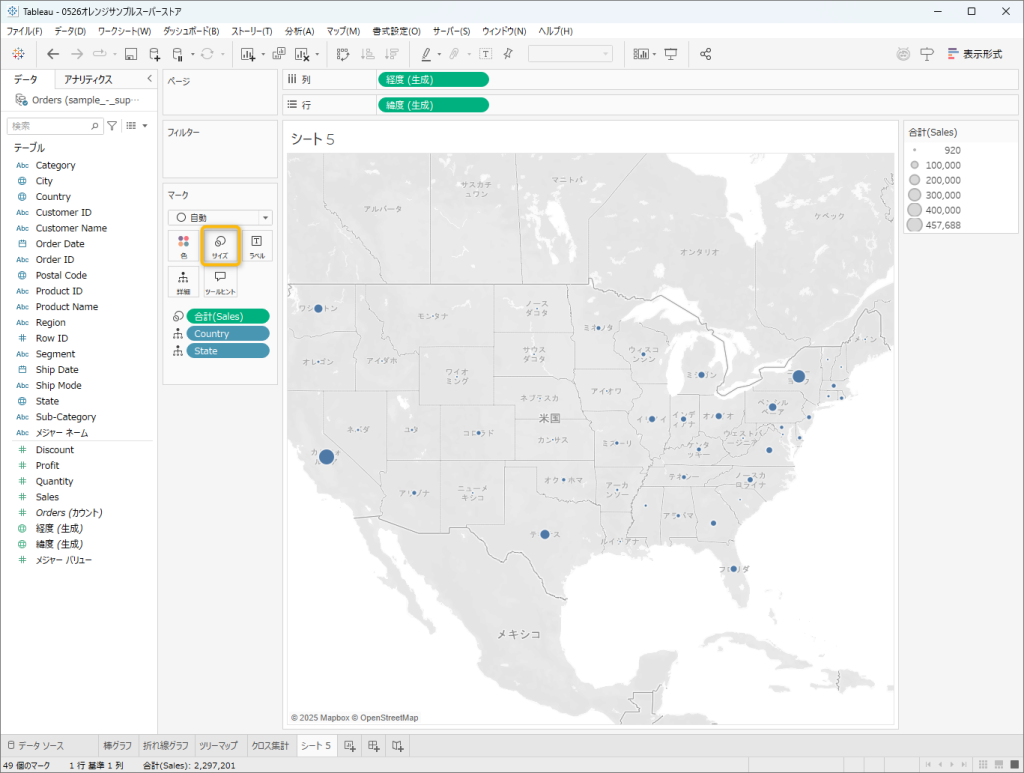 「売上:Sales」をマークカードの「サイズ」へドラッグすると、売上の大きさに応じて、●の大きさが変わります。